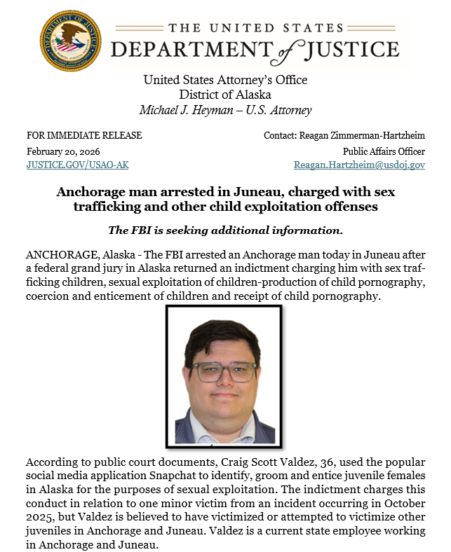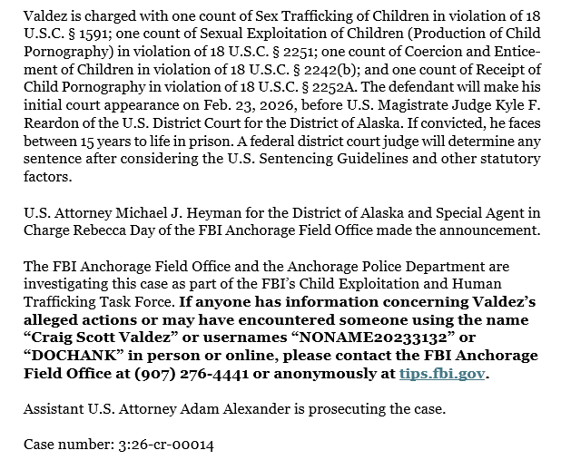 The Anchorage Police Department initially responded to this case in October 2025 and has since worked on it in partnership with the FBI Anchorage Field Office as part of the FBI’s Child Exploitation and Human Trafficking Task Force.